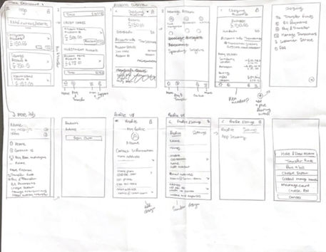 Specific to Accounts: The bottom navigation was deemed irrelevant during initial sketches as it was not specific to any account. With a clean and detailed home page, options have been transferred to each account section, such as the pay and transfer feature.